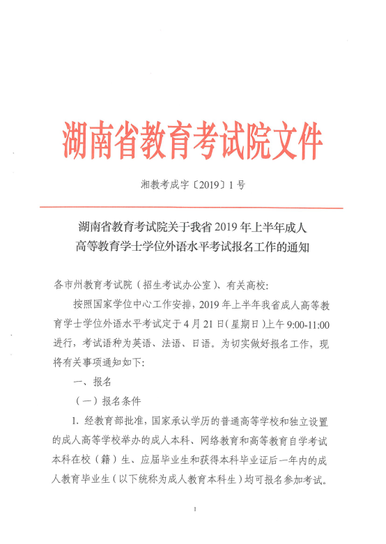 2019年上半年我省成人高等教育学士学位外语水平考试定于4月21日(星期日)上午9:00-11:00进行,考试语种为英语、法语、日语。为切实做好报名组织工作,现将《湖南省教育考试院关于我省2019年上半年成人高等教育学士学位外语水平考试报名工作的通知》(湘教考成字〔2019〕1号)转发给你们,各函授站请认真学习文件精神,及时通知学生按规定要求报名。