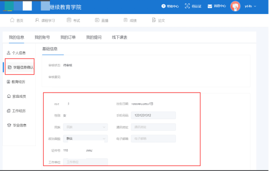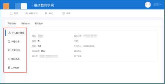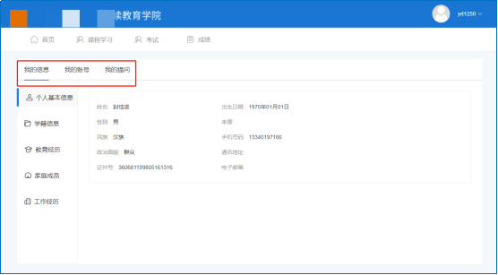 点击进入界面后,可查看“个人基本信息、学籍信息、教育经历、家庭成员、工作经历”