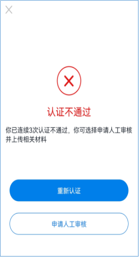 注意:若人脸识别已连续3次认证不通过,可以申请重新认证,或申请人工审核,须上传露脸手持证件照、证件正面照、证件背面照。待人工审核通过后才可完成实名认证。